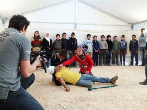 في ملتقى هارموني بحمص، عُرض الفيلم الوثائقي “شكسبير في الزعتري”، والفيلم يرافق مخرج العمل الفنان نوار بلبل عام 2014، منذ وصول بلبل إلى المخيم ولقائه بأطفاله، وانتقائه أبطال مسرحيته المزمع تجسيدها في المخيم ومن بطولة الأطفال. المفارقة اللطيفة أن نص المسرحية هو مقاطع من مسرحيتين عظيمتين لوليم شكسبير: الأولى مسرحية هاملت، والثانية مسرحية الملك لير. وأثناء العمل والتدريبات في خيمة كبيرة نسبياً وعلى الأرض اليباب، تعرّف الأطفال على شكسبير وأحبّوه، فسمّوا الخيمة باسمه، وكتبوا على قماشها من الخارج: “خيمة شكسبير”، وعند الباب رسموا صورة له.